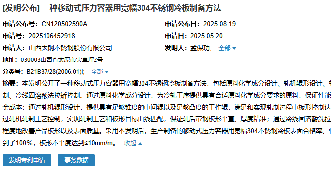 時(shí)間:08/20/2025 01:25:418月19日,山西太鋼不銹鋼股份有限公司成功申請一項(xiàng)名為“一種移動(dòng)式壓力容器用寬幅304不銹鋼冷板制備方法”專利,申請公布號為CN120502590A,申請日期為2025年5月20日。